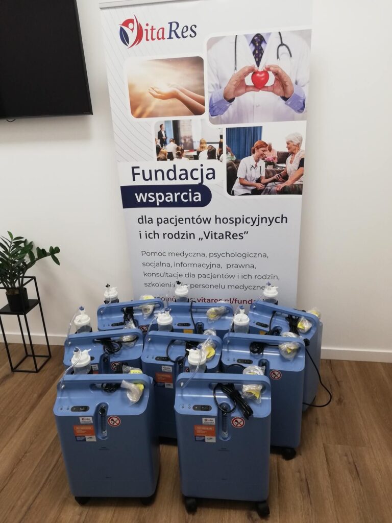 Fundacja Wsparcia Dla Pacjentów Hospicyjnych i Ich Rodzin „VITA RES”, jako Obdarowany, przy pomocy środków otrzymanych od Darczyńcy – Fundacji Studenckiej „Młodzi-Młodym” – uzyskanych z wpłat naszych darczyńców z 1,5% podatku dochodowego za 2023 rok oraz środków własnych, zakupiła osiem koncentratorów tlenu firmy Philips dla pacjentów hospicjum domowego. To kolejna piękna inicjatywa naszej Fundacji i zaszczytny cel – pomoc osobom będącym w potrzebie.